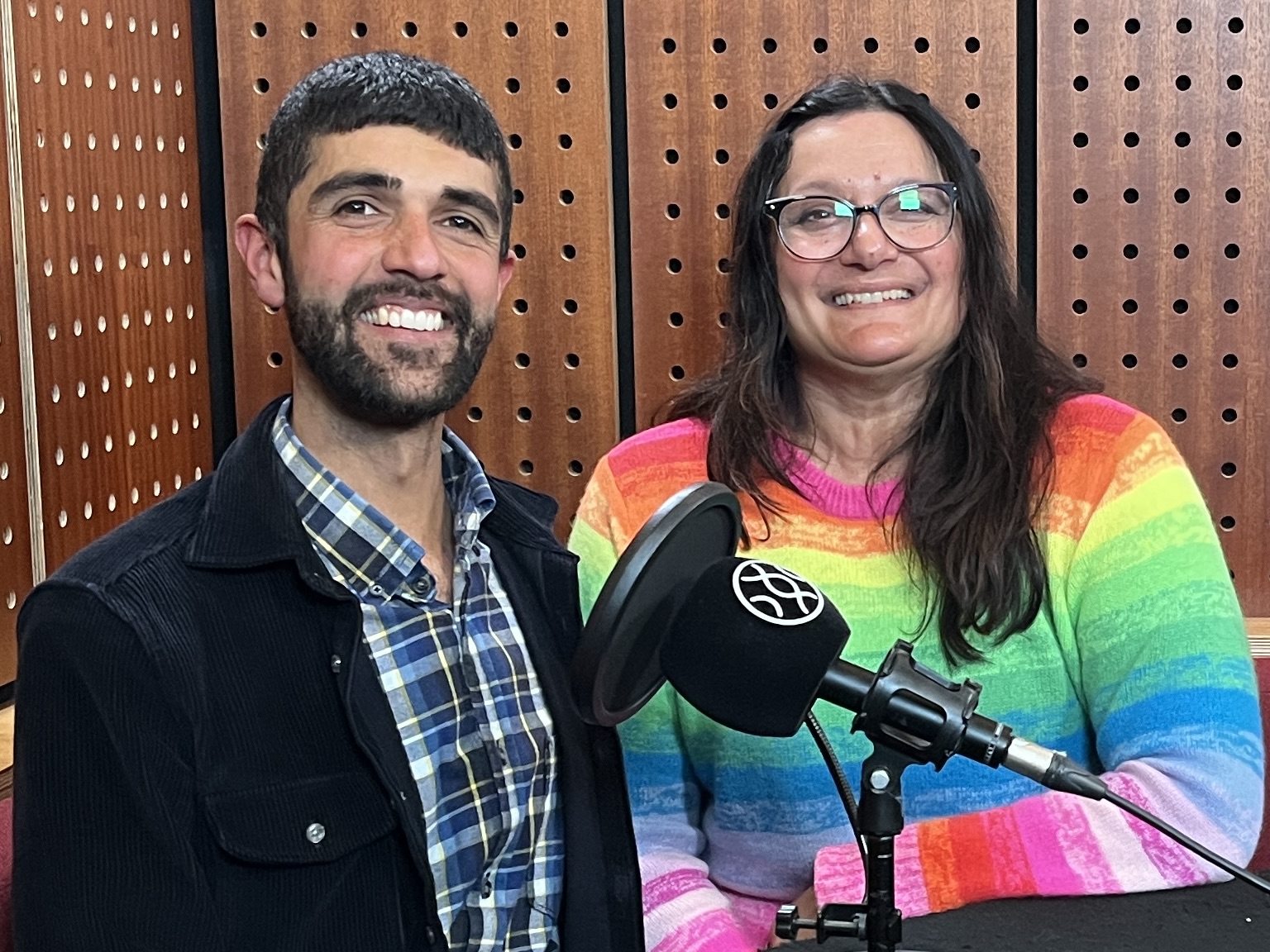 Ajay with Sarah Mukherjee MBE recording a live episode of Sustainable Matters.